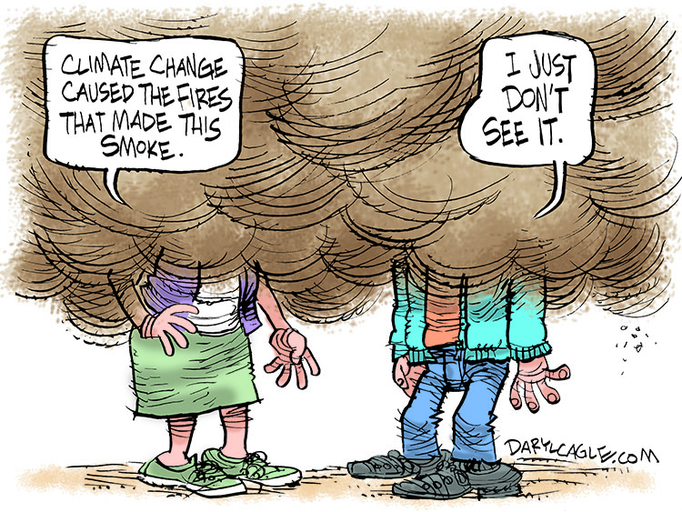 [00:34:29] Daryl Cagle: “You’re so stupid. It’s not smart, sad.” When we were having giant fires, I had the couple talking to each other with their obscured by smoke and can’t see anything. And one says, “Climate change caused the fires that made this smoke.” And the other one says, “I just don’t see it.” And that’s enough about me, gentlemen.