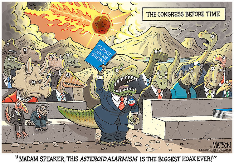 [00:01:21] Daryl Cagle: Thanks. Okay. Lots of people are listening to us in audio only, so I’m gonna read and describe the cartoons. Just bear with me when I do that. And RJ we’re gonna start with you. Here’s your first one. You’ve got, Congress Before Time, and they’re all dinosaurs. And one Republican dinosaur says, “Madam Speaker, this asteroid alarmism is the biggest hoax ever.”