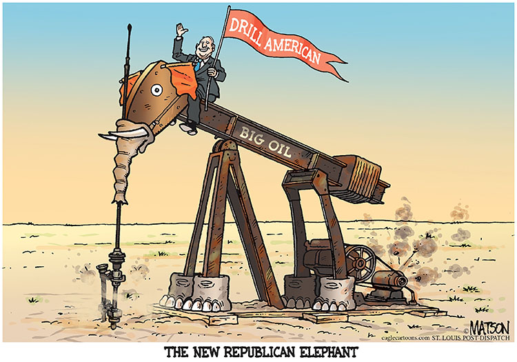 [00:05:37] Daryl Cagle: Here RJ you’ve got a big oil guy riding on an oil rig thats made to look like a elephant. It’s the new Republican elephant. this is another timeless cartoon,