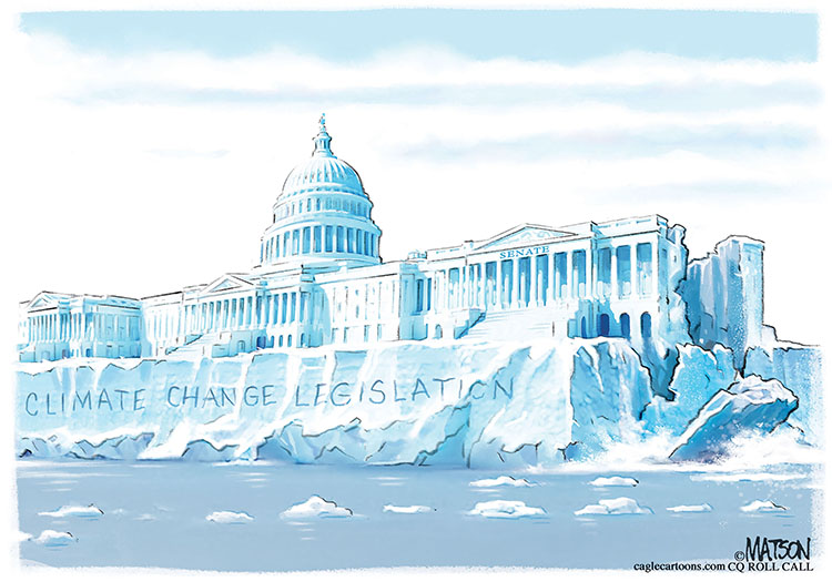 [00:03:41] Daryl Cagle: right. So here’s, uh, frozen capital, particularly the Senate, and it’s on, uh, an iceberg that’s breaking up and it says climate change legislation. That’s a great looking cartoon, beautiful piece.