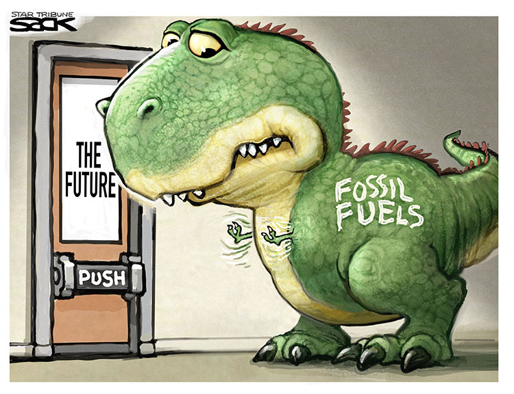 [00:43:08] Daryl Cagle: Our dear, retired Steve Sack who, draws uh, Tyranosaurus Rex with tiny little hands. He’s labeled fossil fuels and he’s trying to open the door to the future, but his hands are just too small to open the door. I think that’s wonderful. Hmm.