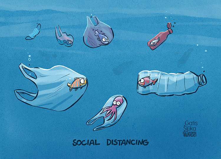[00:45:10] Daryl Cagle: I would think. Anyway, I thought that cartoon was nice. Mm-hmm. Uh, here’s, uh, one from Gatis Sluka from Latvia, and he’s got the fish in, they’re all trapped in plastic containers. It says social distancing. Yeah, this is a great cartoon. Cartoon. Very good.