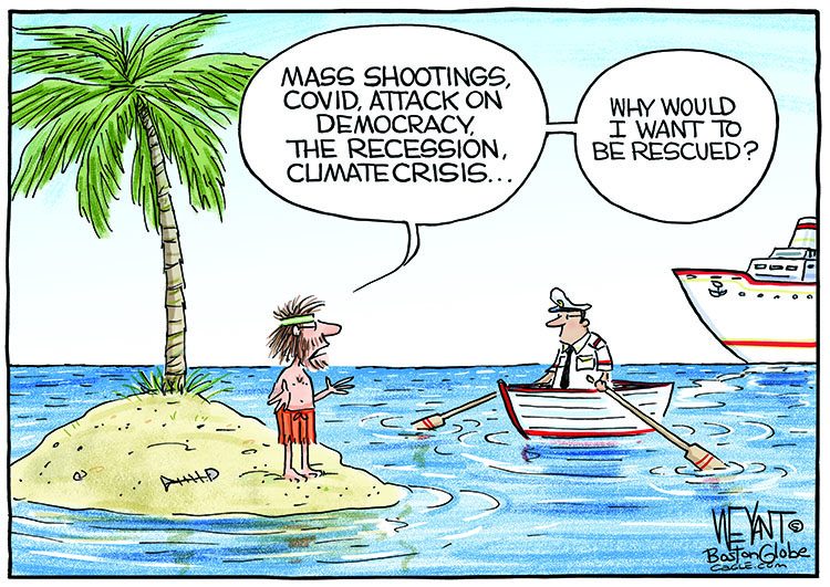 [00:36:34] Daryl Cagle: it’s sad. Here’s, Chris Weyant, um, he’s got the guy on a desert island being rescued, and he says, mass shootings, covid, attack on democracy, the recession, climate crisis.