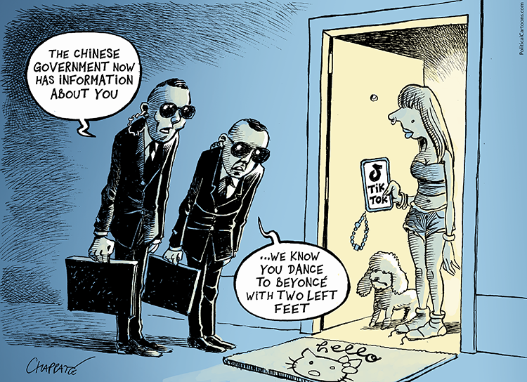 So Patrick's cartoon shows two Chinese government people at the door of a typical American TikTok user, and one says, "The Chinese government now has information about you." And the other one says, "We know you dance to Beyonce with two left feet."